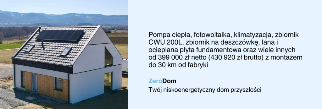 ZeroDom to dom niskoenergetyczny (31,46 kWh/m2/rok), który dba o jak najniższe koszty utrzymania domu. Posiada m.in pompę ciepła, fotowoltaikę, zbiornik CWU 200L, zbiornik na deszczówkę oraz wiele innych.